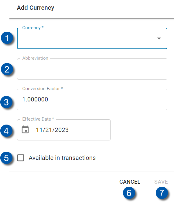 ![]() | Abbreviation | The abbreviated name for the currency fills automatically when the currency is selected. This field is read-only. |