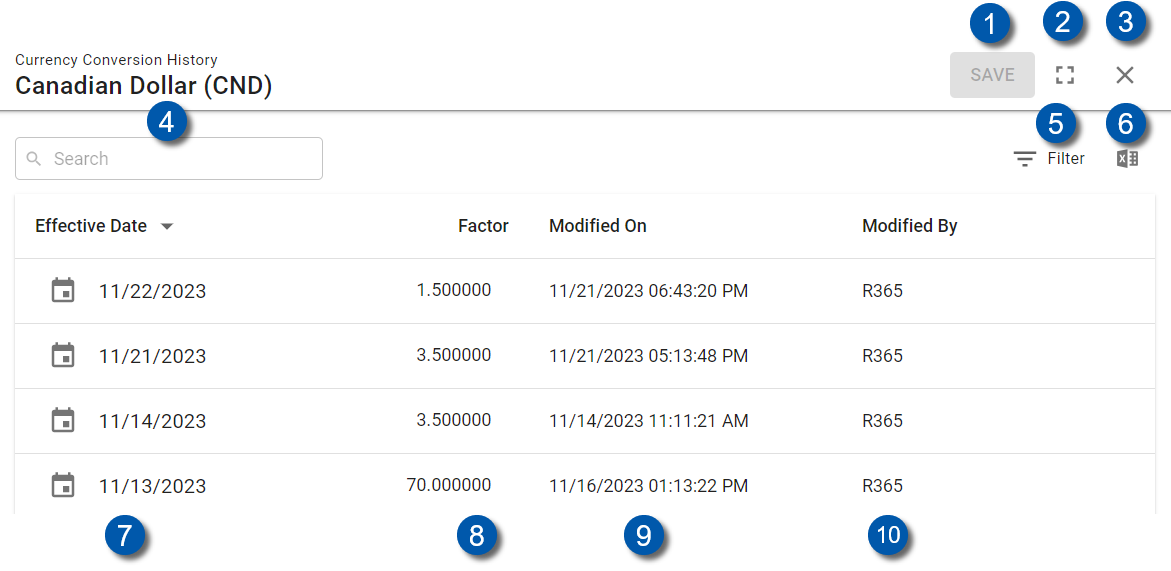 To learn about tasks performed on this screen, see Working with Currency Conversion Factors.