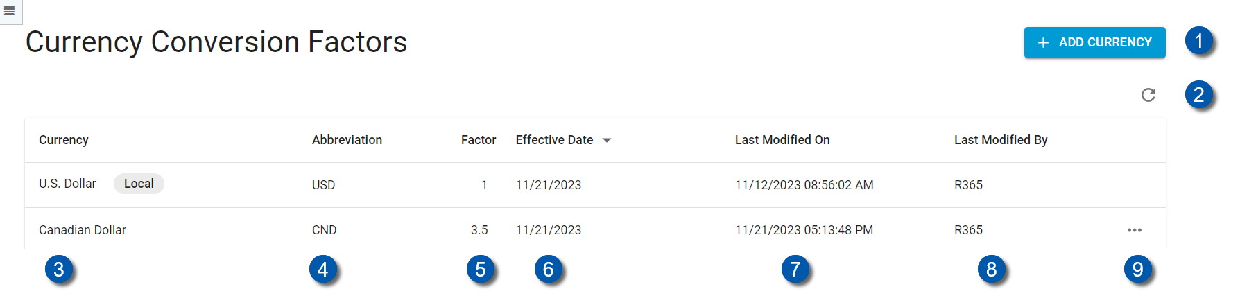 This article is an overview of Currency Conversion Factors, a screen in the Administration section of the Accounting module of R365. Accounting Admins use this screen to configure which currencies are available on transactions so that other users can view this information on invoices when a currency conversion is applied.